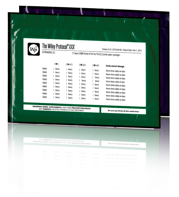 All of the Wiley Protocols® are individually standardized for methods, materials, pricing and packaging, and are compounded with FDA approved pharmaceutical grade ingredients. Each prescription comes in color-coded applicators and Mylar envelopes with corresponding directions for ease of use. A personal calendar is used for a rhythmic dosage scheduling. Dosing instructions are provided on the packaging of all Wiley Protocols.