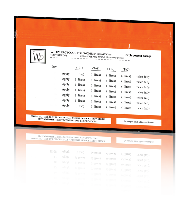 The Wiley Protocol® Testosterone transdermal/topical cream for women is rhythmic, accurately biomimetic and is designed to replicate feminine testosterone hormone rhythms that compliment Estrogen and Progesterone. All other testosterone prescribed for women, on the market – to date, is simply taken from the same template used for men. The Wiley Protocol® Testosterone for Women is provided in bright orange envelopes and matching capped transdermal syringe applicators.